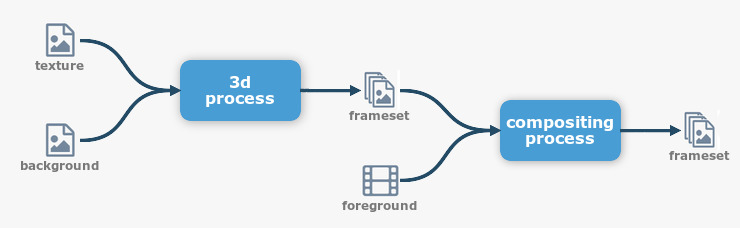 - Inputs: shoot, sub graph-node to merge, 3d scene rendering frames.
