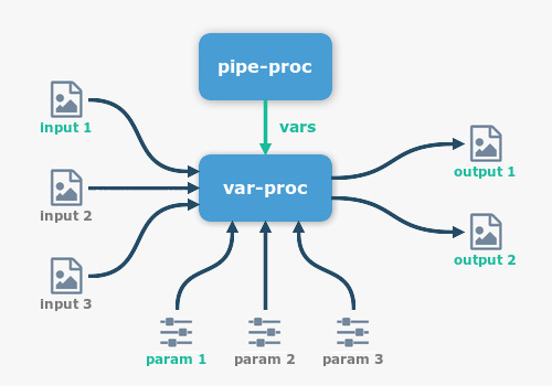 To automatize the rendering iterations, a process can be variabilized (var-process) and played by a pipeline process (pipe-process) with the expected values.